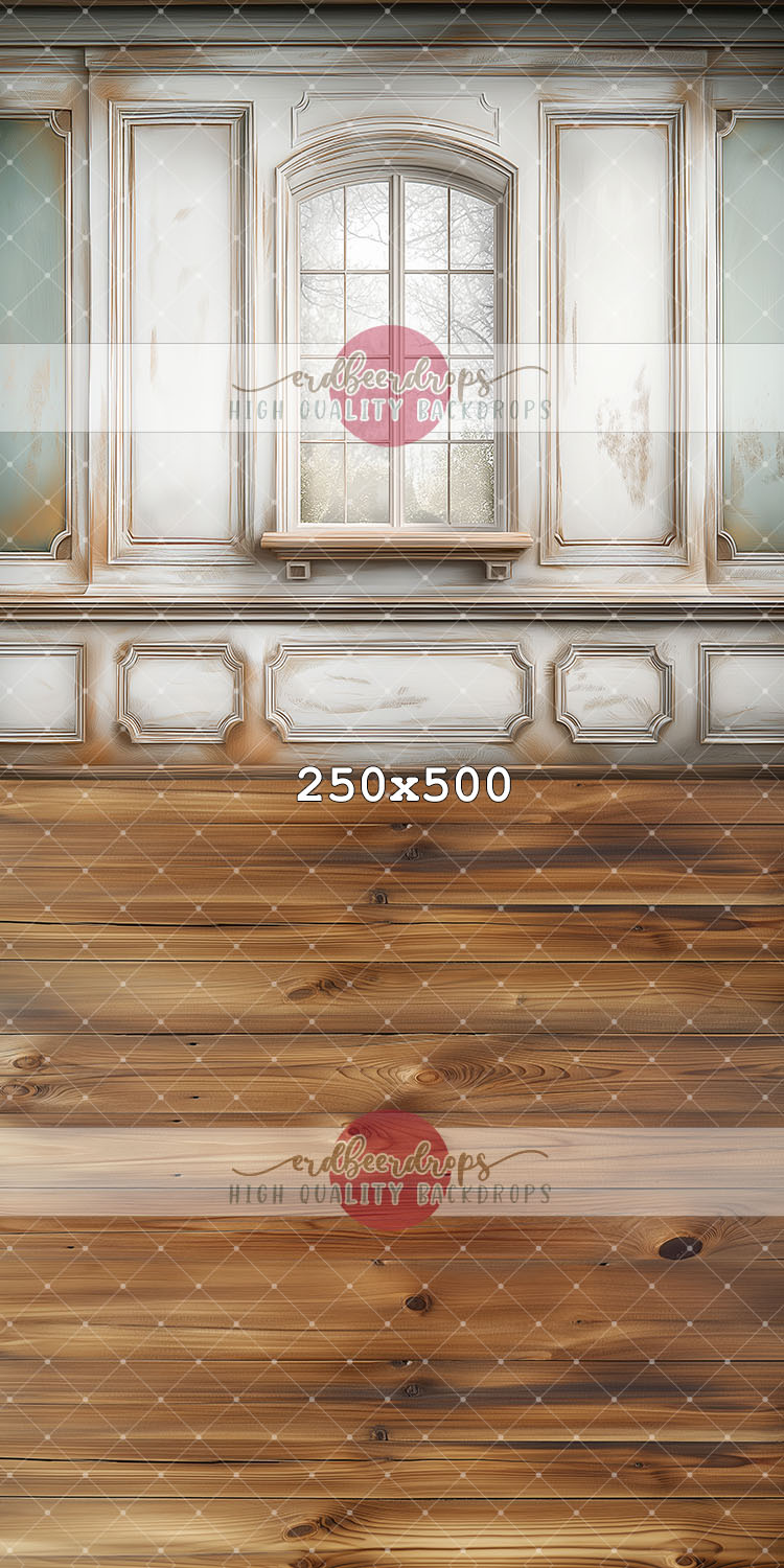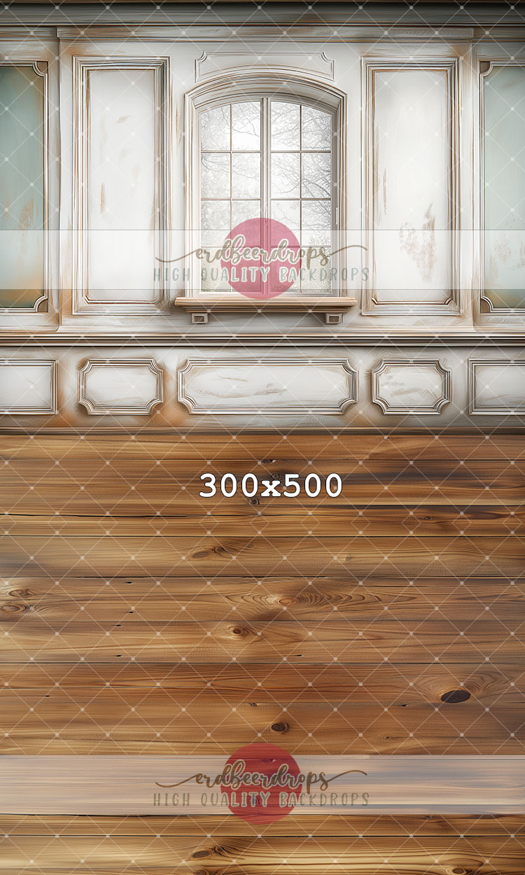 Das schlichte Fenstermotiv bringt eine Helligkeit ins Bild, die wie weiches Tageslicht wirkt. Durch die stilisierten Wandpaneele entsteht eine dezente Tiefe im Raum – ideal für klassische, warme Portraits mit natürlichem Vintage-Flair. Der zurückhaltende Boden greift die hellen Farbtöne des Hintergrunds auf und wirkt fast wie geweißtes Holz oder gestrichener Putz – völlig ohne visuelle Härte, ideal für weiche Lichtsetzung und reduzierte Looks.